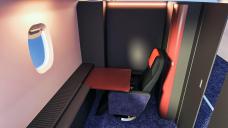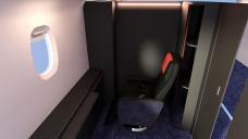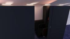 Ok, so here is the first-class cabin. It comes with a movable and rotating first-class chair, with an adjustable seatbelt. The Room has an animated door, laptop tray pullout, and a small cabinet you can place small objects in. Then a foldout bed that has a bed cover that will extend for covering your characters while asleep.