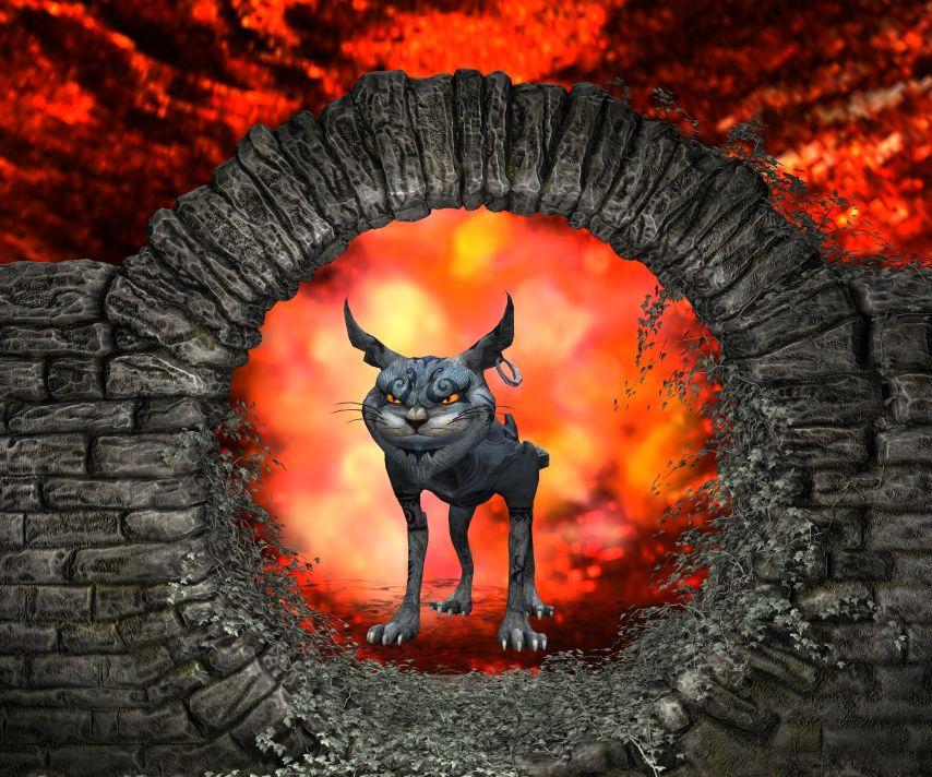 1 terrain, moon gate from daz (removed the gate), cheshire cat (free from the net), sphere with fire material, an HDRI sky.