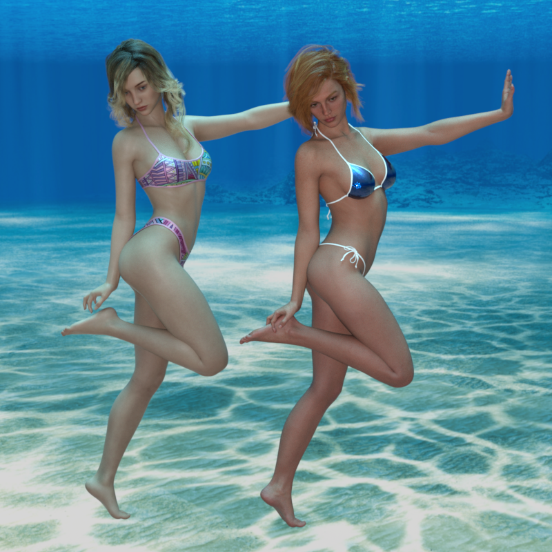 Pose shown: BBarbs freebie 'Just Elegant 07' from Renderosity, Characters CHB Milan and V9. Background is Namtar3D's underwater HDRI available somewhere on this forum and at Renderosity.