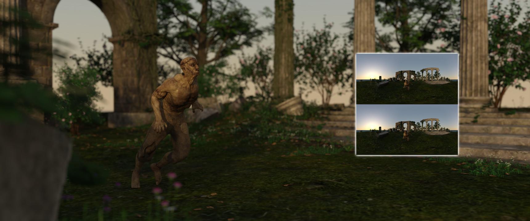 This appears to be Frankenstein going for an evening jog through some ancient ruins. The ancient ruins environment works well with stereoscopic 3D.