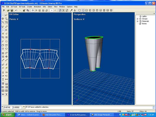 It's exactly the same thing with UV mapping, except you're trying to apply a 2D texture image to a 3D object. If you were going to apply a texture to a pair of pants for your 3D character, you'd make the same seams that are in a real pair of pants. The fabric is the texture you want to apply.