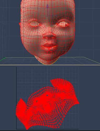 Just to give some idea of the limitations of Carrara UV unwrapping. This is the "Babyface" model which comes with Hexagon. I've unwrapped it using the standard method for heads - seam up the back of the neck to the forehead, then a seam across the forehead. One pin in the centre of the forehead and and another on the bottom vert in the centre of the front neck.
