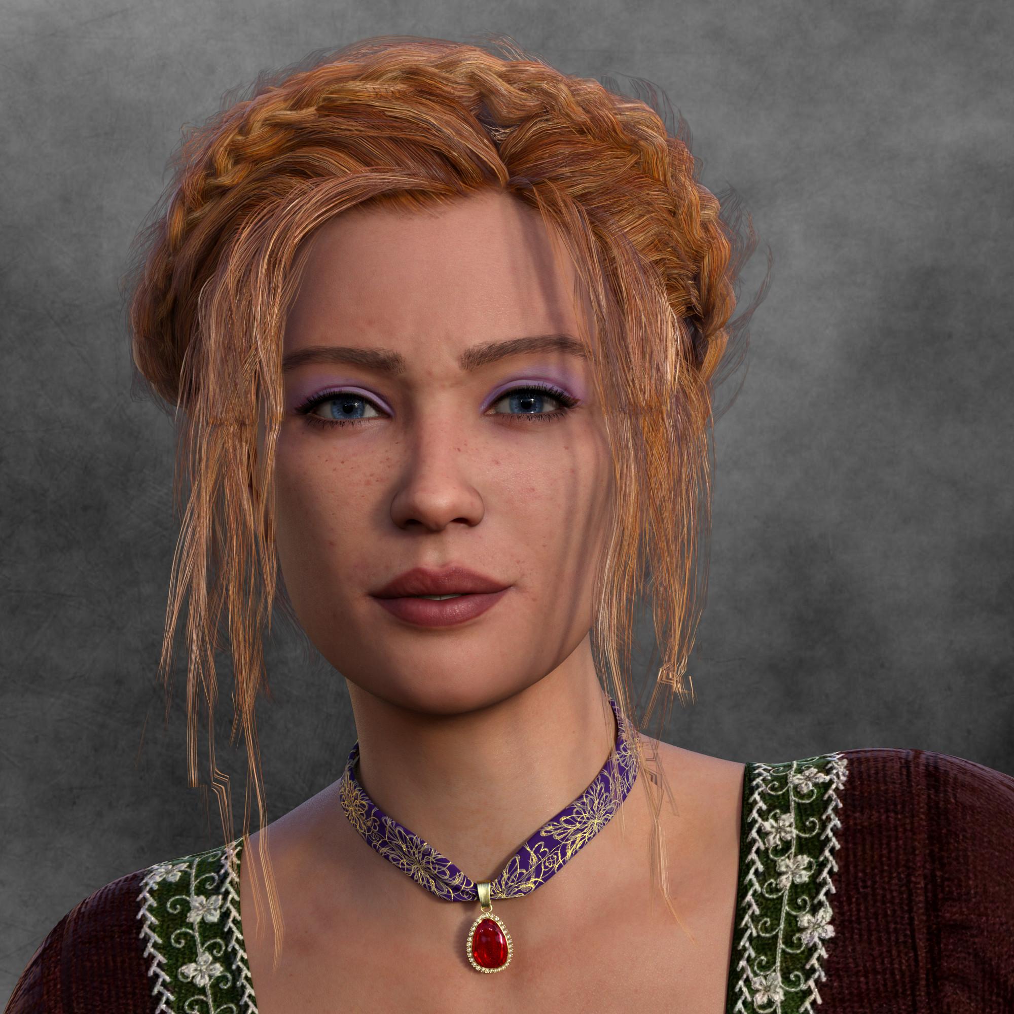 I thought I'd add my G9 character to the thread. I created her for another thread, but after seeing this thread I thought I'd put her in a portrait setting with the detail setting turned up. it's mostly me playing with dials using one of the default skins that come with G9. I added some G8 hair with autofit, but none of the posing dails would do anything so I couldn't bring the braids from the back to the front or anything like that. I did add some eyeshadow to match the background color. :)