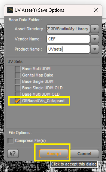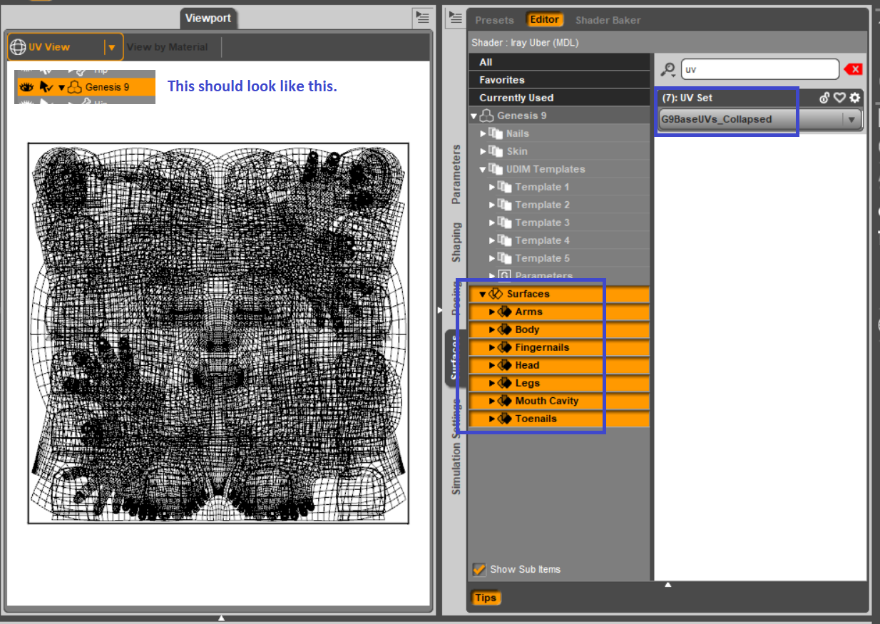 Load G9, do not touch the uvset that is applied. Why is because D/S appears to not be working as desired to switching them back to default. We want the default load to become the collapsed UVset.