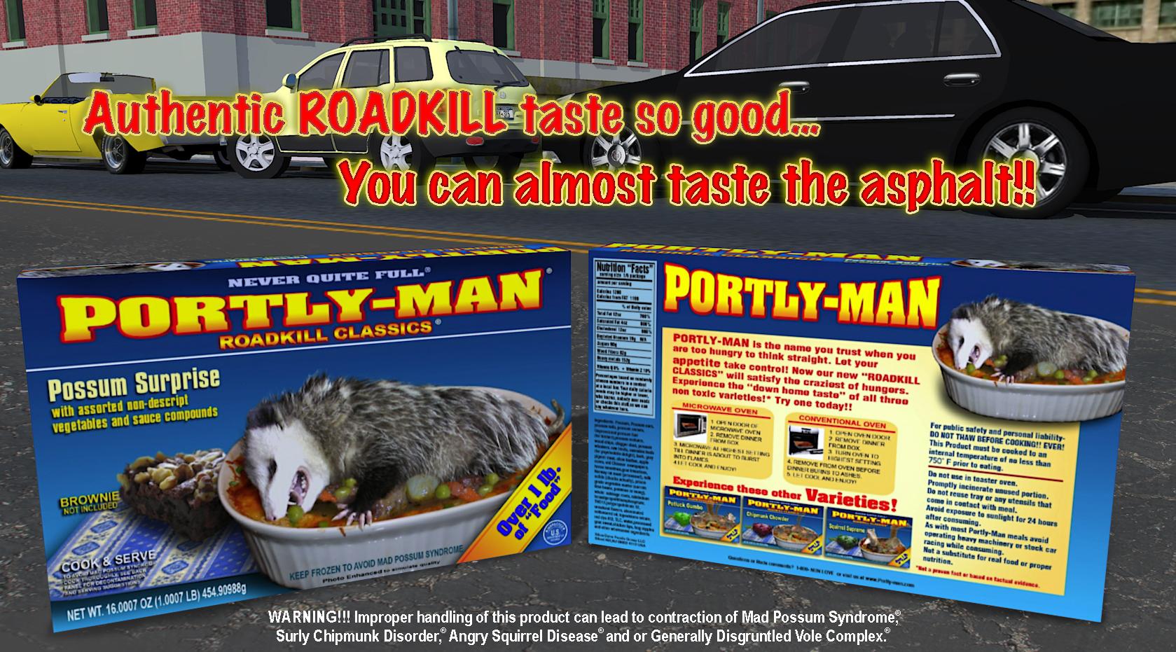 Portly-Man makes a whole frozen dinner... for that fresh homemade possum taste anytime you want it...