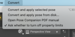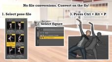 - Press the Ctrl + Alt + P hotkey, or select the "Convert and apply selected pose" menu item in the "Convert" menu in the Daz Studio menu bar.