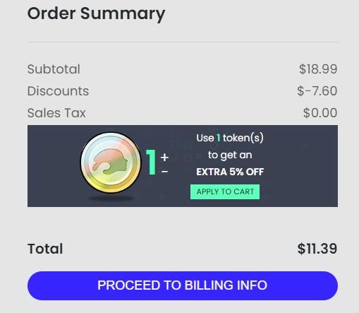 3. I press the little "-" sign beside tokens. The button changes to "apply to cart". The price and the discount remain unchanged because I haven't clicked "apply to cart". When I do, the discount will go to 0, the price will go up, and the button will change to "apply to cart" with the maximum number of tokens (1 in my case). (screenshot Cart3).
