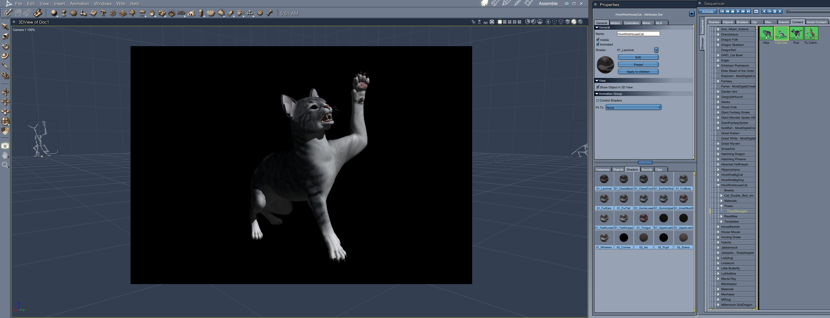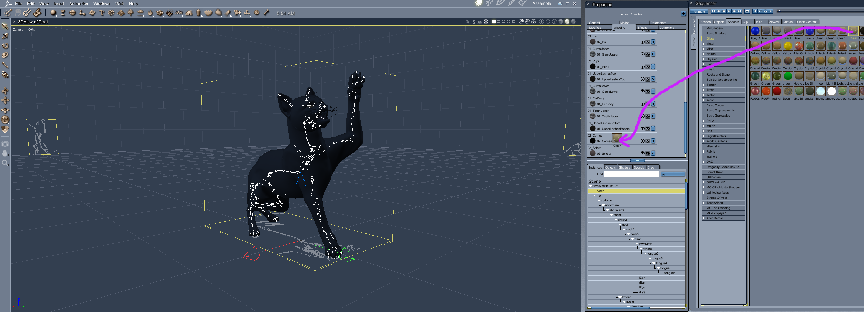 Stezza, I had these problems before with the House Cat, and you helped me out over at Hivewire. However, even back then I couldn't get the eyes right. You posted pictures of the cat with the correct eyes. Sorry to be harping on this, but I can't for the life of me get the proper eyes to work with any of the cats, House or Big Cat. Please, if it's not too much trouble, could someone give me a blow by blow listing on how to get the proper material on the eyes of Hivewire's House or Big Cat. I've tried everything everyone listed here, but somewhere I'm missing something. Again, this is loaded into Carrara through the DS library and posed correctly, proper shaders added to all things EXCEPT the eyes.