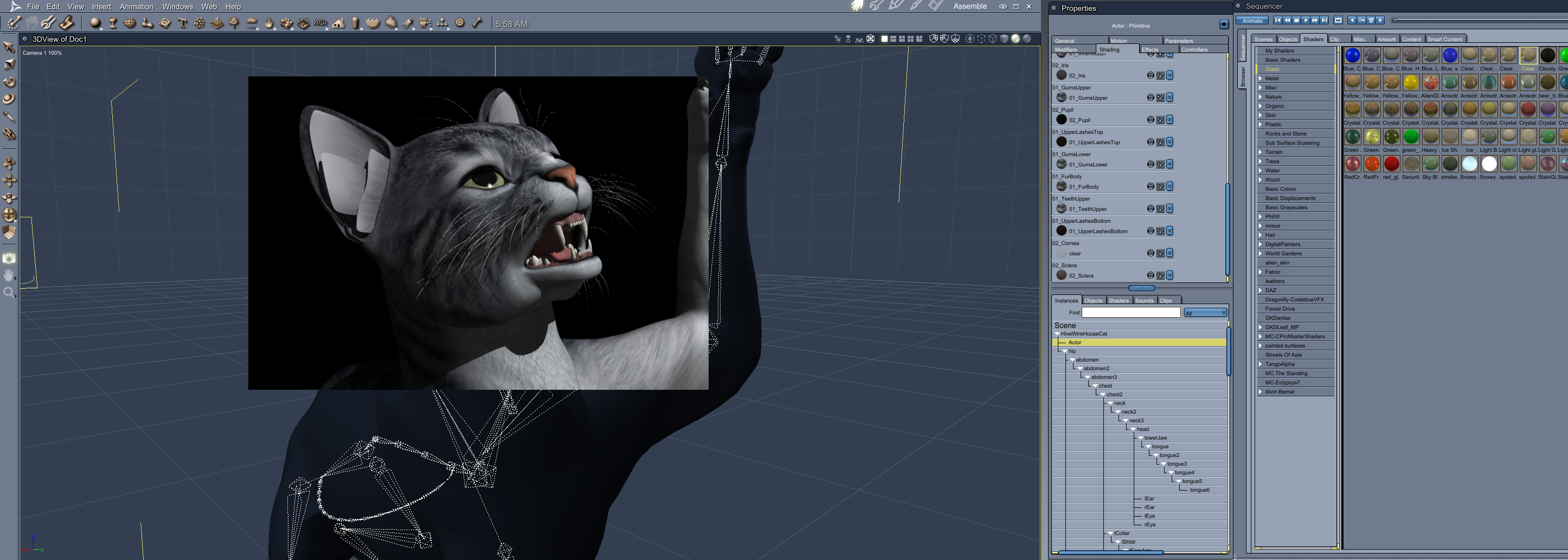load up your lion or leopard or panther the drag the shader you saved in the shaders tab to the leopard or whatever cat you loaded.. you will have a leopard with a house cat texture with all the trans hairs working... then in the shader room change the fur body from the house cat to the leopard by manually loading it from wherever it resides on your PC.