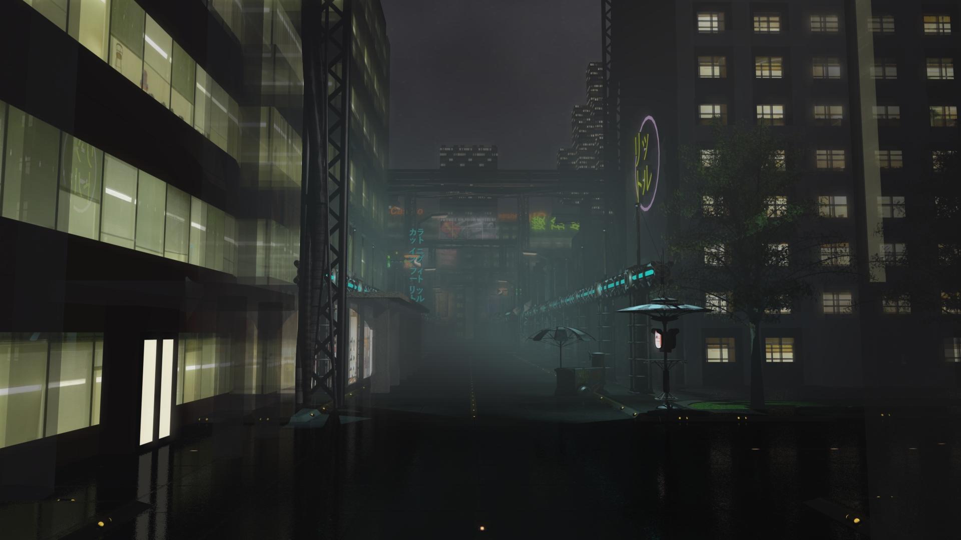 Besides PhilW's Night and Day City and Central Business District kits, I'm using future elements made by Coflek-Gnorg: Techno Town and Sci Fi City. Mostly just a few signs, the info stations (one by the tree) the food cart and those support structures we see all over. Since Coflek-Gnorg's kits had those cool futuristic street curb lights, I also used his streets combined with Phils. Phil's blend into the other, giving it that wet look. I love happy accidents, and that's one of them!