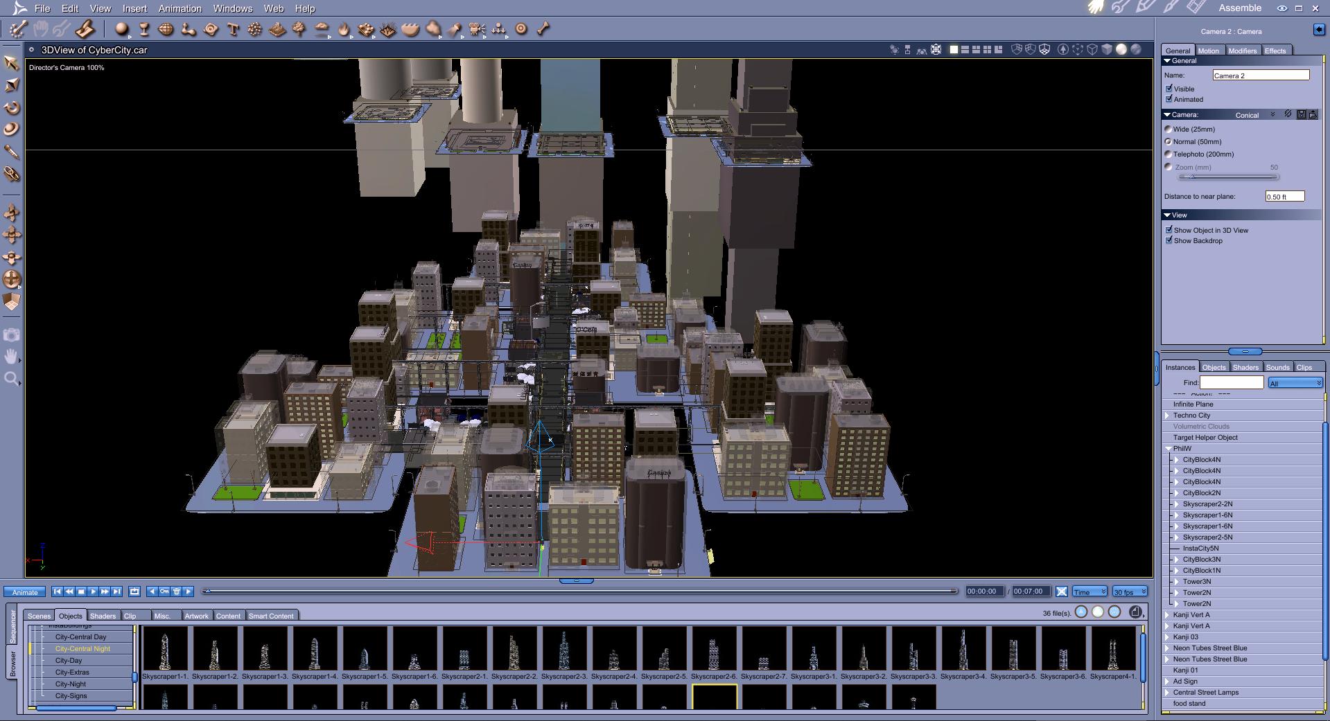 Here's a screen shot of the scene so far. Some of the skyscrapers aren't showing up.
