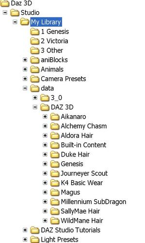 Struggling with 3 Genesis files - would it be possible to put them all into one or would that make it difficult for DS to find them, because I then want to add quite a lot of Victoria 4 meaning perhaps a total of 7/8 files ? Then there's several other content items I'd like to add after that. The problem is it makes the list or tree in the scene's Content folder incredibly long and therefore hard to remember what and where the many sub-folders are inside them all.