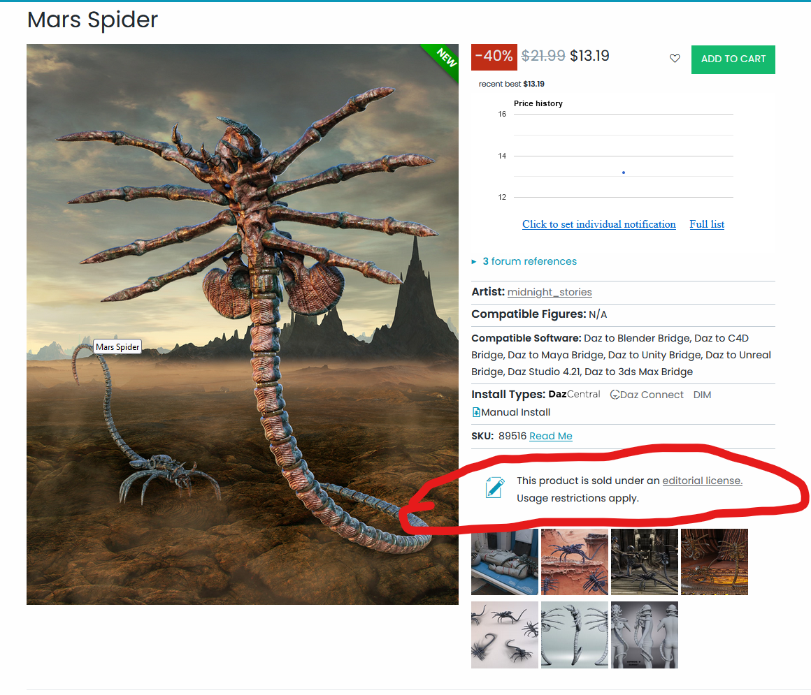 Hopefully this was a mistake that they have corrected - I'm not seeing ANYTHING about an Editorial License or a warning on the page now. I even checked the Read Me - nothing.I'm going to go ahead and get it.If you are using the Daz Deals add-on and have disabled the "Optional Licence Add-Ons then you will not see it. I'd suggest you flip that setting off and look again before committing money to it (assuming you care about the Editorial licence)