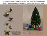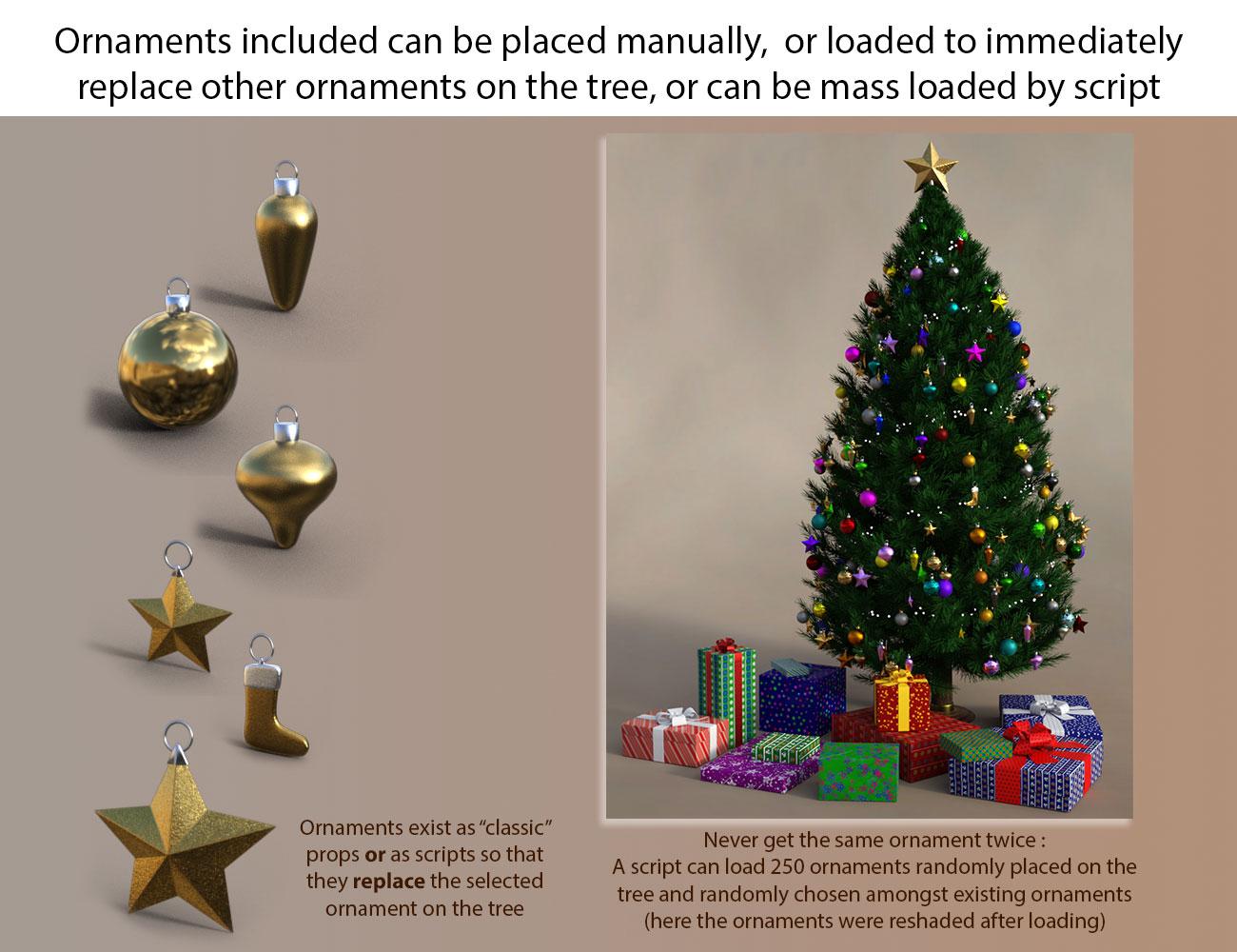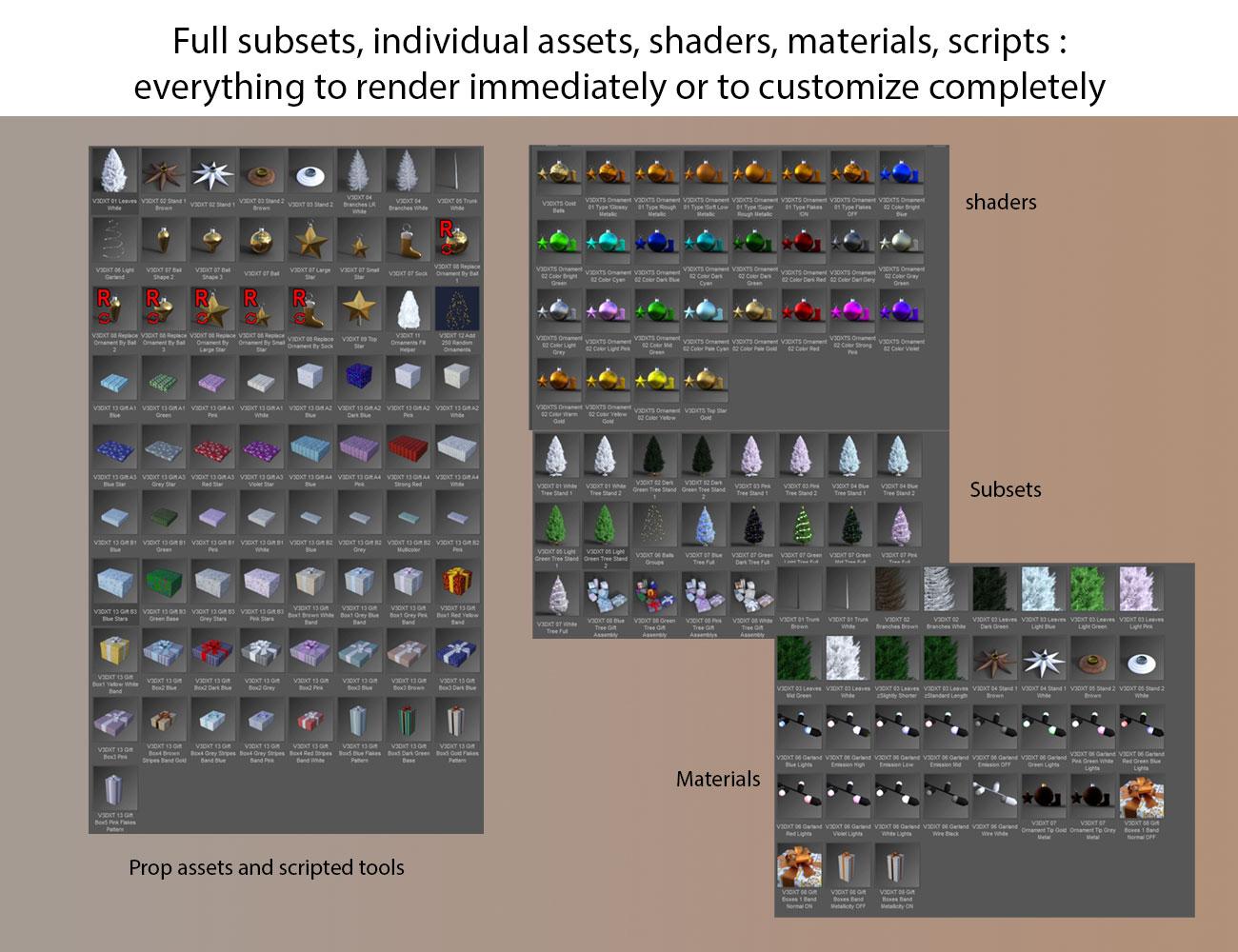 - V3D Christmas Gifts and Tree : a set of gifts and Christmas trees to place in any room you want to give it the perfect “Christmas touch”! The trees come in several colors and ornaments variations, and really cool tools are included for the tree. The "leaves" can be made thinner/thicker (morph) or shorter (material). Several tree ornaments props are included, and new ornaments can be placed manually on the tree, or if you want you can use the script which will randomly load 250 individual ornament on the tree (on random tree locations, with random types of ornaments). Furthermore, scripts allows you to replace any tree ornament by another type of ornament “in place” (you can replace anywhere in the scene a “ball” by a “star” by simply selecting the ball and use the “replace by star” script). A light garland is included with 3 possible different emissive colors, various emissive materials presets are included for it but you can setup the 3 emissive colors you want. The gifts can be loaded individually or in a group of gifts already created to be placed “under” and in front the tree, and there are 4 of these groups available in 4 different colors themes. As individual props for gifts, there are 11 different gifts, all different both in term of type (shape, foldings, boxes or wrapped paper) and sizes. Each gift can be loaded with a minimum of 4 different materials, allowing you to reach more than 40 different gifts. If you use the “gifts shaders” in addition, you can reach an incredible amount of possible different and unique gifts! In brief everything can be either used as is, or is fully customizable!
