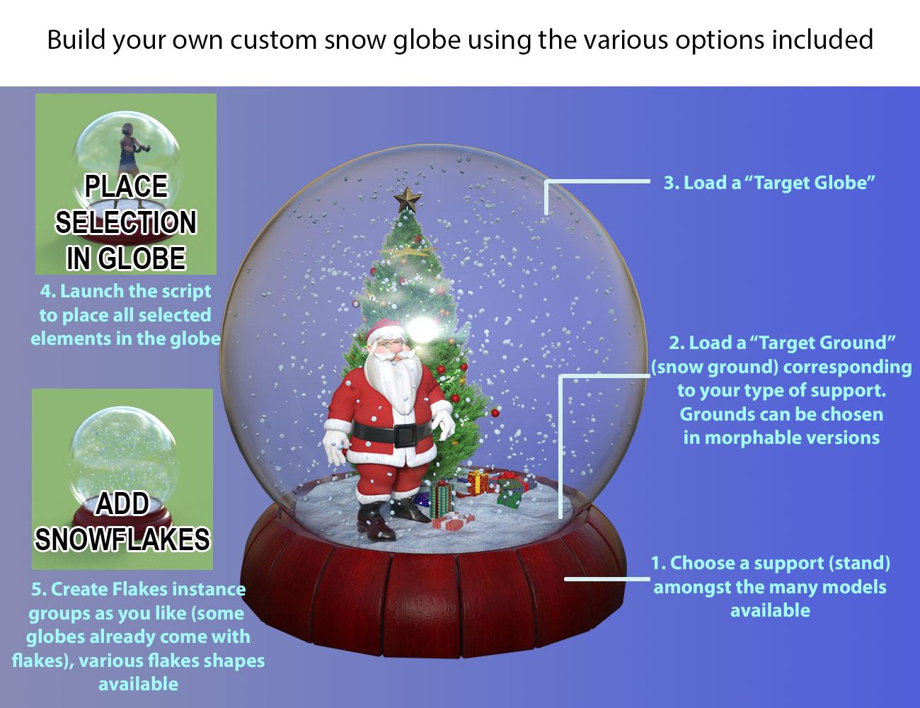 - Snow Globe your World : all the props, shaders and scripted tools you need to put anything you want in a snow globe easily (a script will do everything for you), to reshade it if you want to, and to create instance groups of different types of snowflakes. You can load many different globe stands (supports), the morphable ground can be rescaled to be used as a “classical” snow ground, and the flakes instance groups can be also used for bokeh or falling snow effects (once put at the right scales). Anyway the flakes can be flakes of “anything you want” (birds, butterflies) since you simply have to change the target for the Instance group for that. A script will allow you to perfectly create the instance “snowflakes” groups of your dream, with many options (number, size variations, rotations variations, preferred location, type of flake - several types available). Depending on what you put it, the globe can be used as a decorative prop of any scene, not only Christmas.