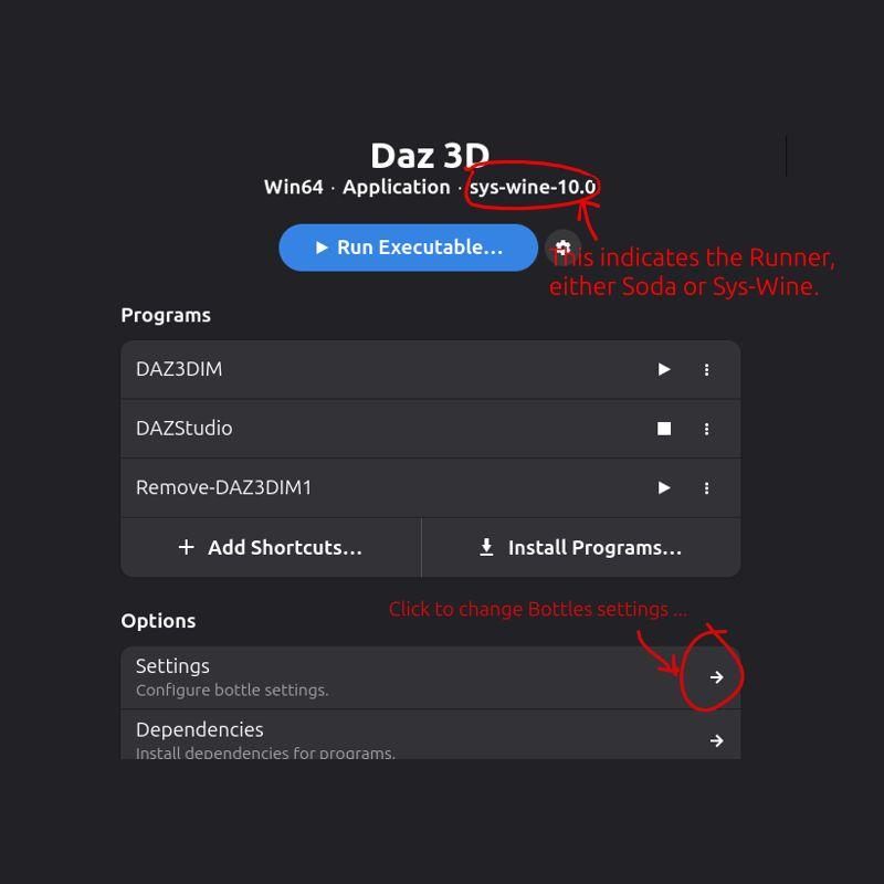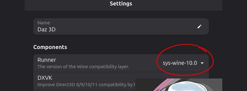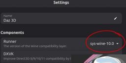 In my Bottles (51.24) setting I have two choices for the Wine compatibility layer, called Runner: sys-wine-10.0 and soda-9.0.1. All along I've used Soda, and the I/O performance leaves a lot to be desired. The CMS phase, when Daz3D starts the persistent storage and goes online to communicate with Daz server, is slow; once I load a DUF scene file, the process of reading and getting the initial render (Filatment or Cartoon Shaded) is also glacial.