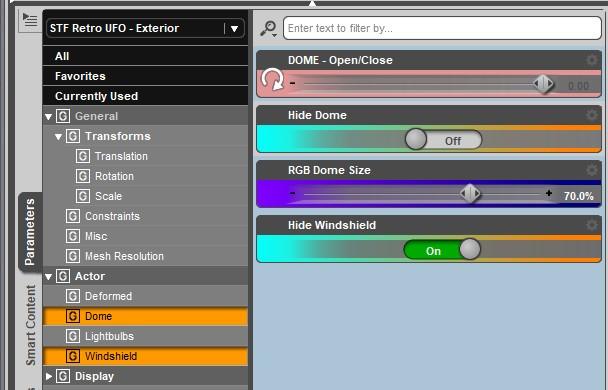 Wondering if I need to reinstall, or just missing something simple regarding the dome vs windshield. I found where the bone is hidden for the windshield, and visible for the canopy, but no matter what I do I can't get the windshield bone to show (using the eye icon, or 'Visible' in the Parameters tab). I checked all the usual places for movement, morphs, textures, no luck. Both the UFO and extra textures were installed with DIM in the latest version of DAZ. Kinda scratching my head on this one.