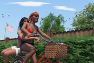 She’s going to a local community pool and the most beautiful woman she knows is going out with her, sitting on the back of her bike. She’s very liberal in her use of the bell, as shown by the position of her thumb. Because Victoria is a meticulous person, she has everything they will need (towels, food, etc.) in the front basket, with two bottles of water visible (but that’s because it’s all I have to show among my props for an afternoon at a pool).