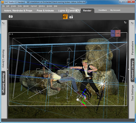Using technique 2, I got my figures and cameras posed correctly on frame 0, but changes to lighting settings did not get reproduced to frame 0 by a pose preset for the light. Things like color and shadow softness were not restored by the pose preset or by copy and paste settings from the parameter tab menu. I no longer have figure motion, but when I render, the light isn't right and I haven't been able to manually find the differences in settings.