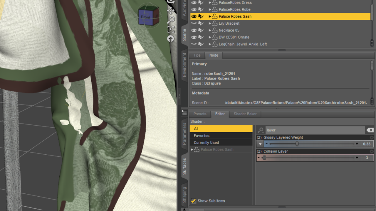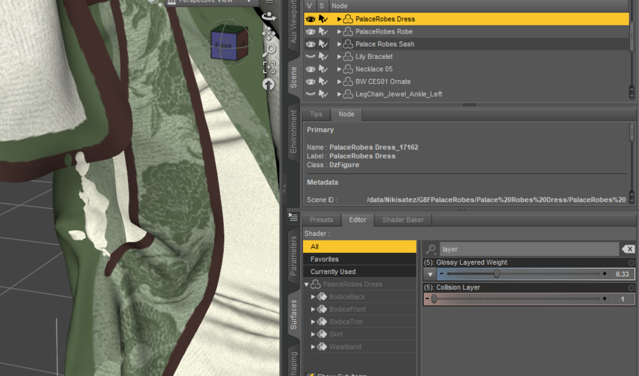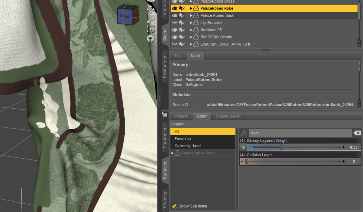 I guess this is a rather common issue with Dforce simulation, sometimes we have clothes comming with multiple layers like this one dForce Palace Robes Outfit for Genesis 8 Female(s) | Daz 3D. I wonder how to fix the issue that different layers poke through each other (not the body poke though the clothes, I think that is relatively easier to fix with fit control pluggin/morphs) when I make a pose of the character and simulate the scene. What setting of simulation should I use?