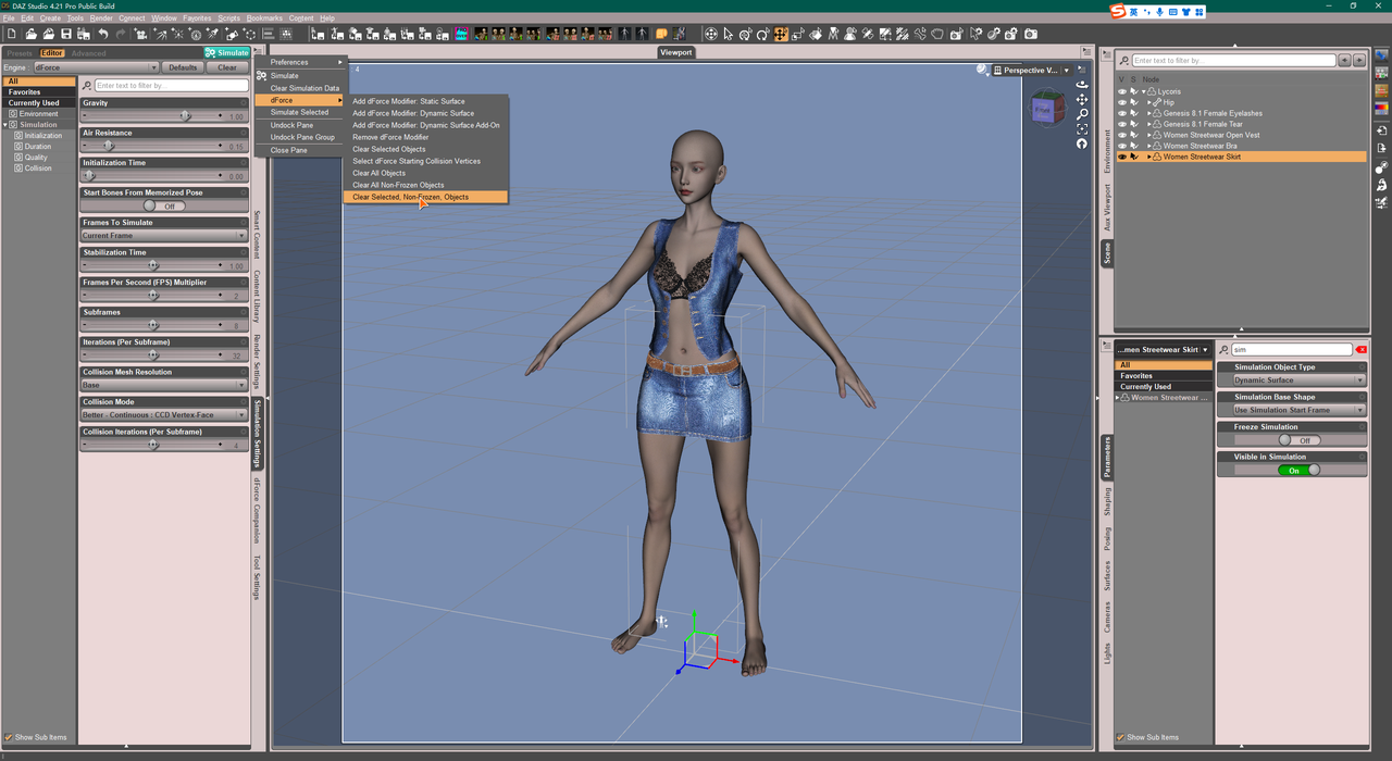 Click 'Clear' button under 'Simulation' button to clear the dForce result of all the garments. If you just wanna clear a single garment's result, select it and go for the menu item...