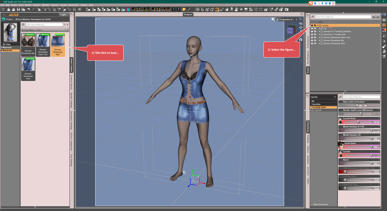 Select the figure and load the garments on it, one by one... Then give her a pose if you want~