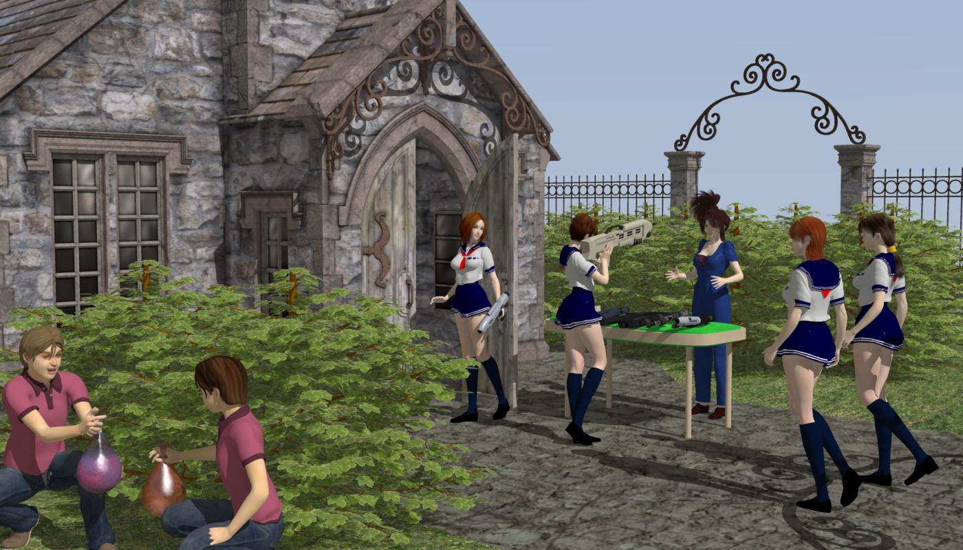 Justin and David picked the wrong day to throw water balloons at their sisters. Today is shooting practice for the new laser guns and laser rifles at the all girls Anime Academy.