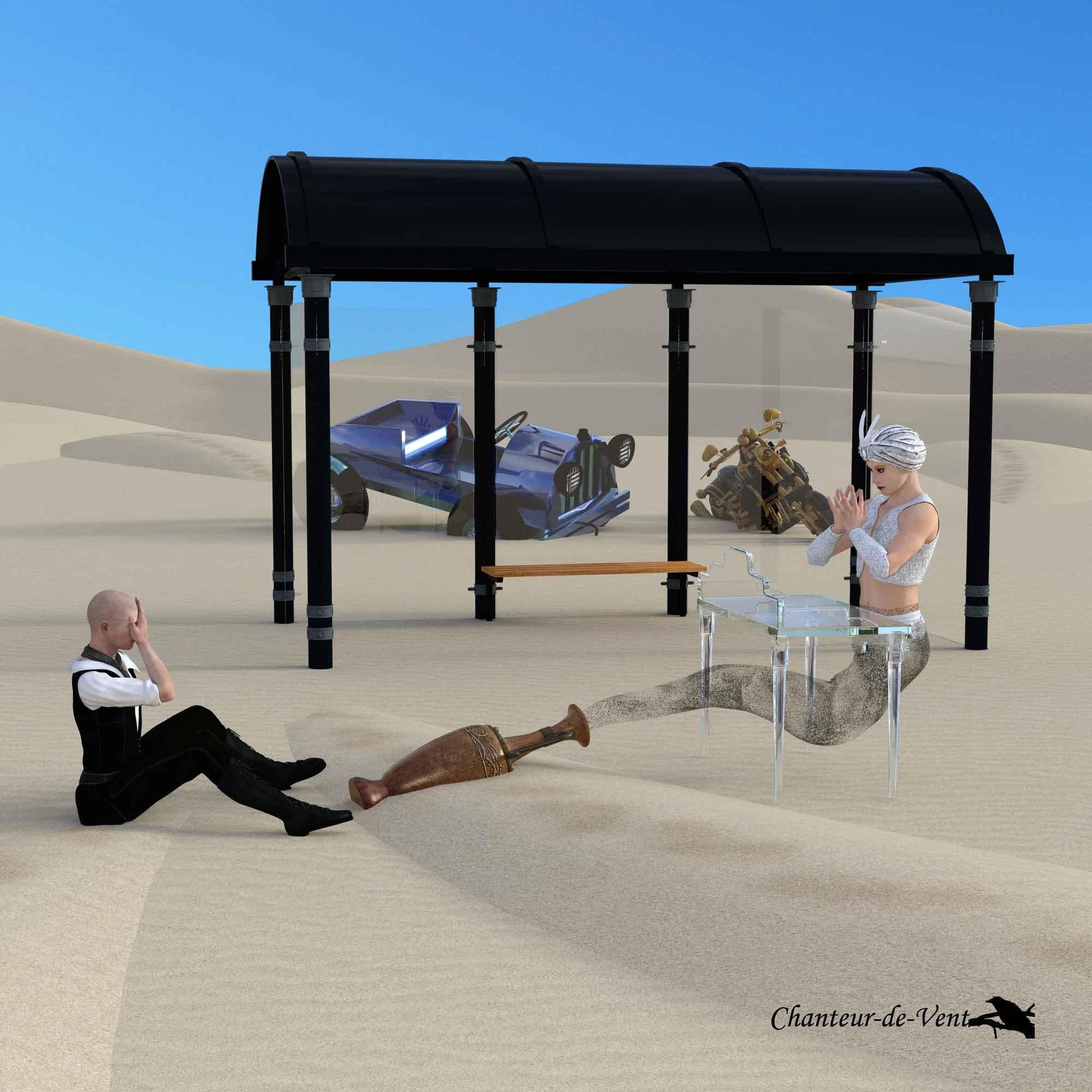Although the poor guy thought he was saved, when a ginny appeared out of the bottle, he soon found out it was to early. Despite the modern proffessional look, the wish-geist had no idea what one was talking about. To him, "Bring me to the nearest bus station" was the same as transporting the bus station directly here, since in both cases the positions of the man and the bus station were the same. "A car then?" The ginny brought some musem-like car, that needed to be started up with a handle. "A motorcycle?" - again some old stuff, with an empty gas tank. No use. "Just get me the hell out of here!" The ginny looked slightly guilty. "I'm sorry, but technically, you had only three wishes. Will you set me free now for all my good work?"