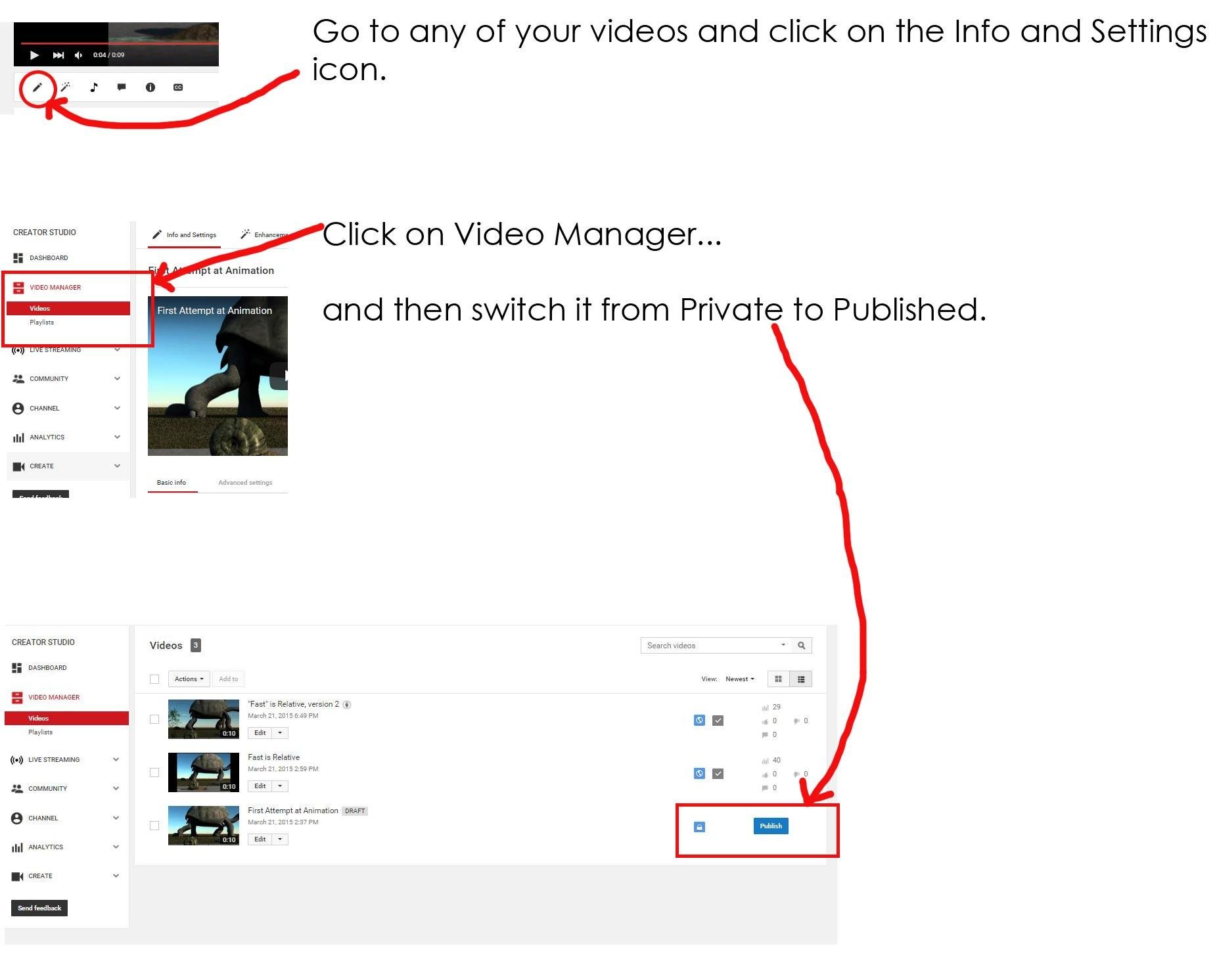 @msteaka - you need to set it to "Published" for others to be able to see it. You usually have the option when you first upload it to have it automatically publish when it finishes loading but of you want to keep it private or forget then it loads as a private video that only you can see. Go to the video and look for some icons underneath it - one of them should be Info and Settings, go to that, then go to the Video Manager and click Publish next to the video you want to make public.
