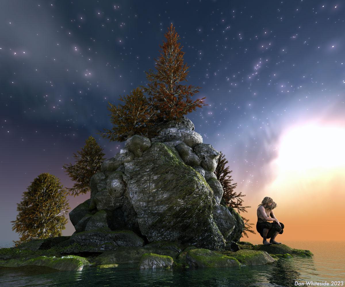 Pretty much based on David Brinen’s Tall Island scene from the Bryce Islands set (DAZ3D). Added some rocky coast objects from THC and Genesis2 male, Both from DAZ3D. HDRI sky by Horo
