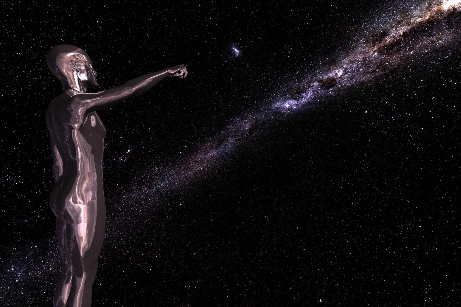 The pointing alien figure is Michael 3 and he points to the Large Magellanic Cloud 163,000 Light Years away from where he stands and where he claims to come from. Backdrop, light and specular exclusively from the HDRI that I faked from a full night sky LDRI panorama in less than 2 days. Credits ESO/S. Brunier.
