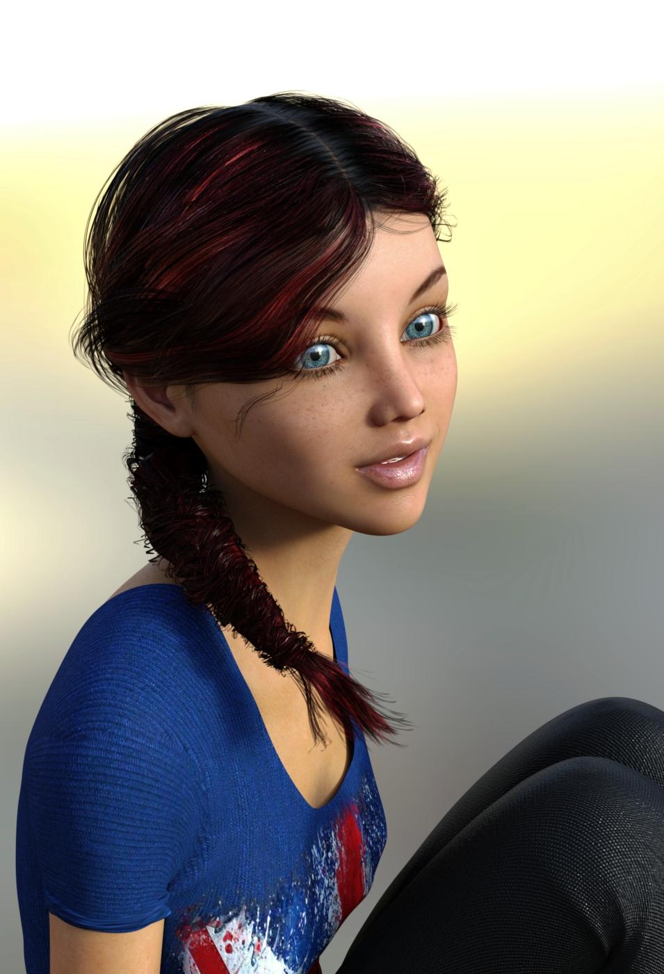 I like her quite a bit, but I did try to reduce the eye size some. This uses the Kimmy texture (with an added eyebrow mask for the translucency to avoid the red brows) and some morphs from the 200 Plus product.