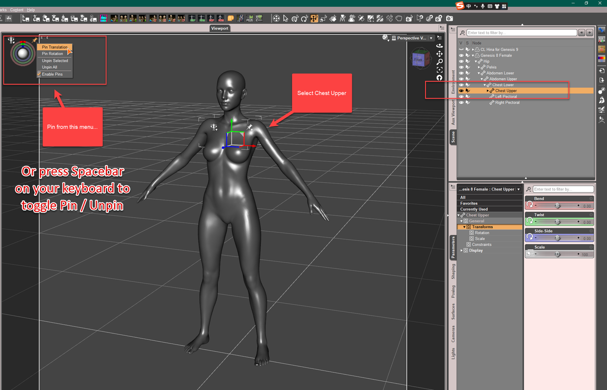 Don't forget that in that particular case there are morphs on the chest, mainly the breast, triggerd by the raised arm - those are not directly the result of the chest bone moving, they are linked, so pinning the chest won't stop movement.