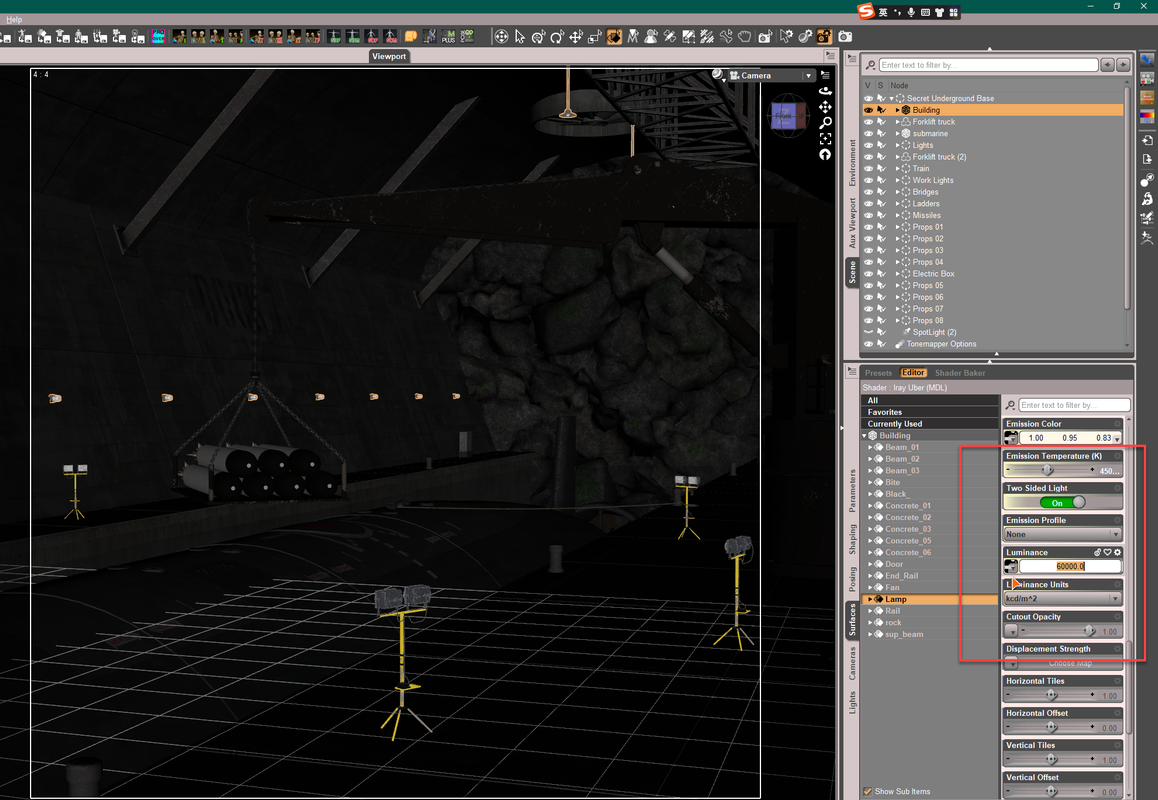 Hi, I recently purchased WW11 German submarine and picked up the Secret underground Base for $2.99 as part of the promo. I had just watched "Das Boot" and thought it might be nice to render the sub in the base as seen at the start of the movie. Only issue is it is all black. I tried adding a spot light aimed at the sub with the Luminous Flux increased to 400000 and it made no difference. I understand from previous posts that Iray doesn't like indoor setting, but there must be a way to light an interior scene like this.