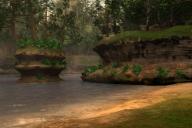 Here's a couple quick pictures of my Dells scene. One is winter and one is summer. I used a terrain, but the rock outcrops and the rock islands are vertex object with various terrain shaders used as distribution maps for procedural shaders and image maps. I didn't animate them, but the parameters were controlled by sliders, so they should be able to be keyframed.