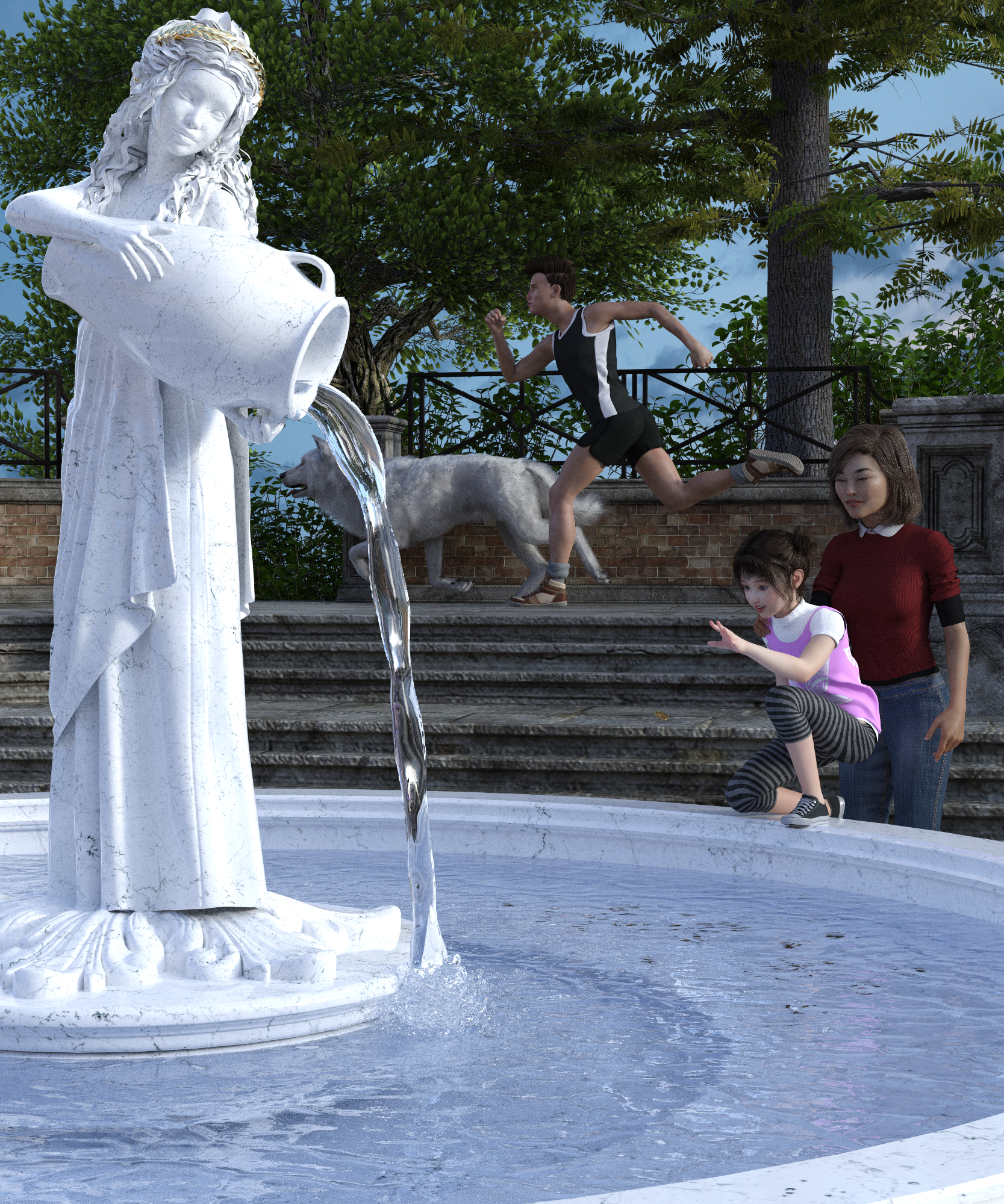 I used kitbashing to make the fountain, as well as the little girl's outfit