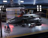My entry into the Intermediate Challenge: Rearming for a Stealth Mission.  This uses the Thor station as a rearming platform and a scaled-down spaceship modified to mount twin Gatling guns (Vulcan cannon) under each wing and a laser rotor on the top of each wing. The pilot is a grey alien. Lighting is the station lighting supplemented with lights from the spaceship and with four six-light generators from a construction set. A robot is restocking the rocket launcher on the back of the spaceship.
