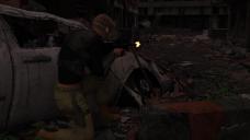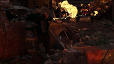 To try and help with the darkness from using a night time image for the image based lighting I'm using I added some flames behind the character and car wreck along with the debris I tweeked, (characters perspective not ours, they are just out of frame.) and some explosions in the vacinity and behind the quad-legged robot I added in version B.