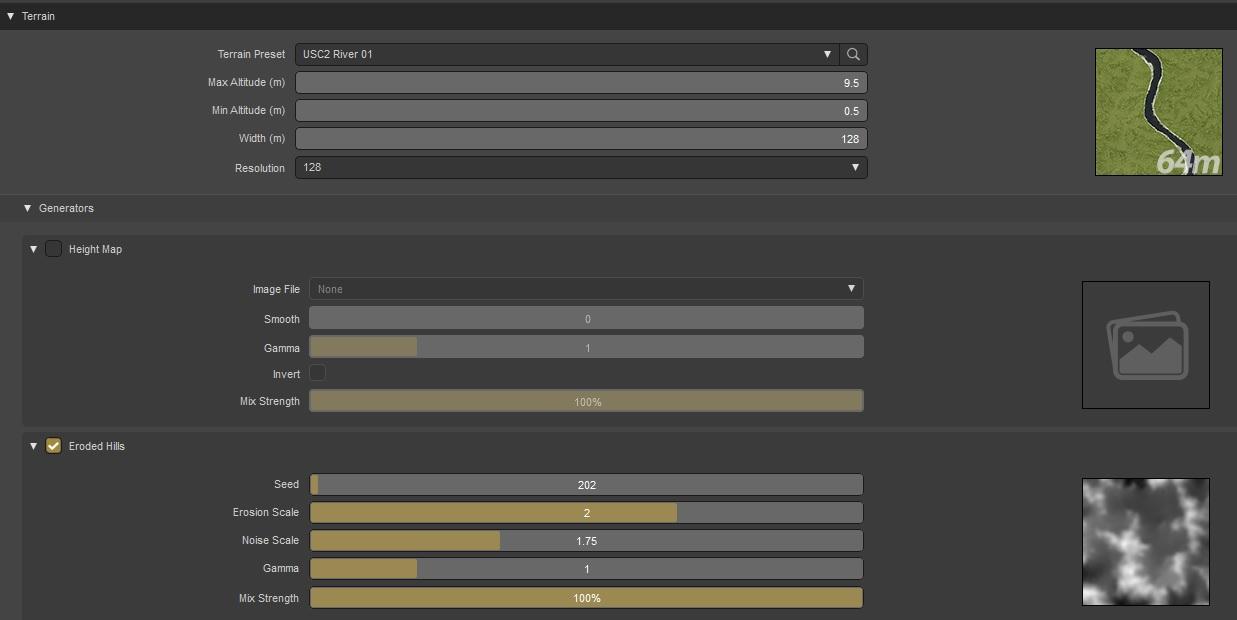 Each USC2 Terrain Preset has its own default size. some are 64M and some are 128M. The terrain browse window shows a thumbnail of the terrain shape annotated with the default size of that terrain.