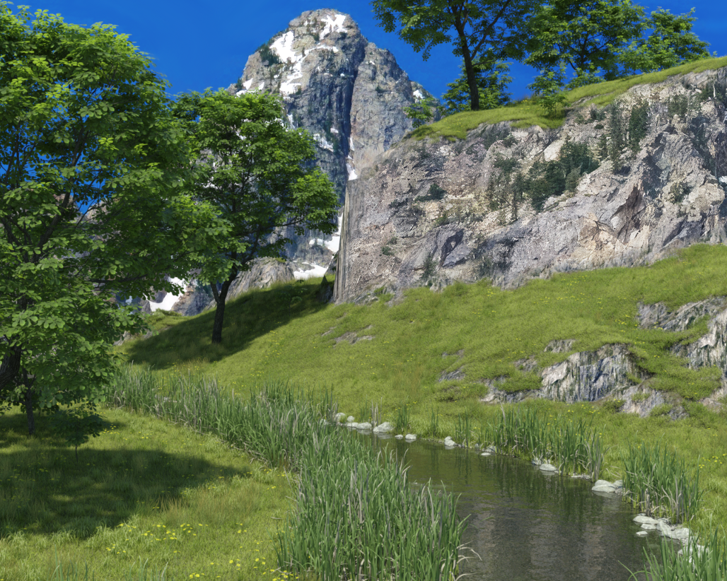 Finally (for now) I'm posting my very first attempt from earlier yesterday, using a USC2 River Feature tweaked for height and I suspect Oaks05 again (I forgot to take note before I closed the scene)