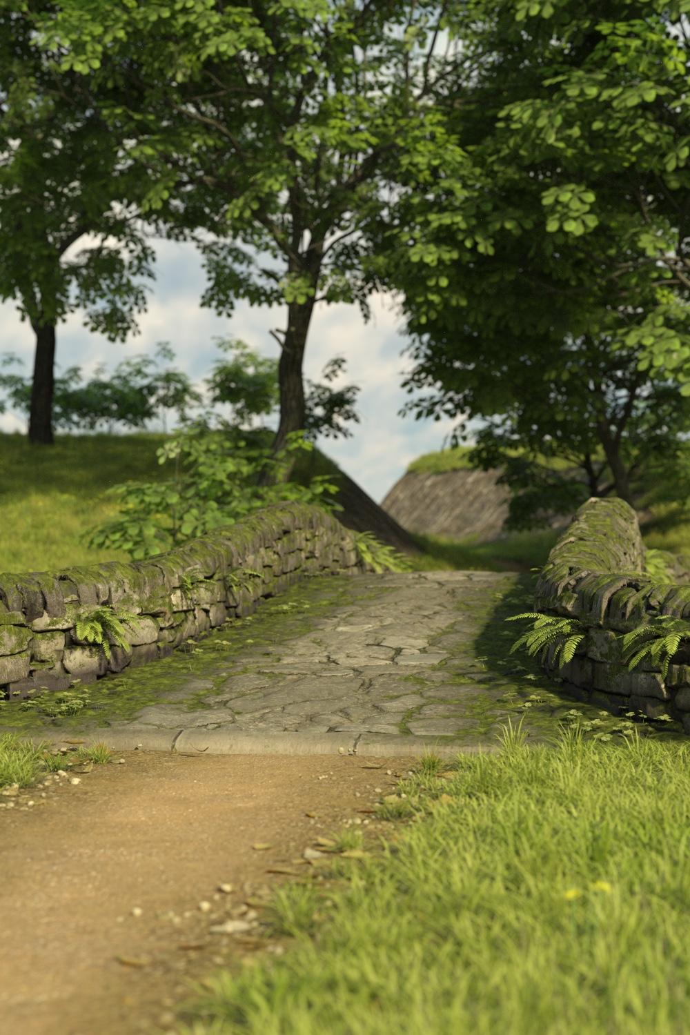 I saw a problem with some grass objects when loading the bridge with fern, but as everything is instanced and the real object is hidden under the bridge, it didn't end with a visible gray box showing an object with missing geometry. Loading the grass patches from USC2 and changing the instances sources will add some grass on the bridge (not visible on the render because I did it yesterday when I was to tired to investigate further and only saw where the grass was hidden this morning).
