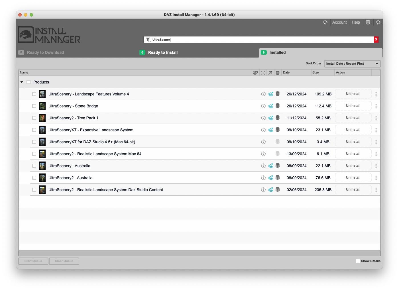 • Right click on the product icon. Does it show an option to Uninstall? If so, that means that the product was installed with Daz Connect. You might also have installed with DIM, but the Daz Connect installation would prevent the DIM installation from even being seen by Daz Studio. UltraScenery products don't work with Daz Connect. If you see that Uninstall option, Uninstall it from Daz Connect. Close Daz Studio, reopen it and try UltraScenery2 again.