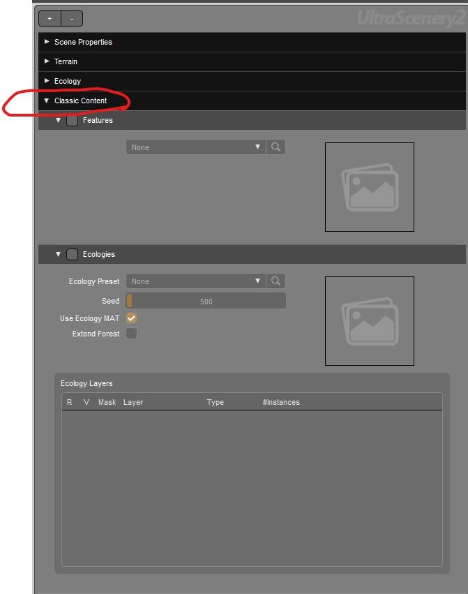 Wow, you are right! I've never tried to save UltraScenry2 as a Scene Subset. So, after reading your message, I tried that today. I used Classic Content and selected River 01 and Oaks 12. When saving it as a Scene Subset, the UltraScenery2 scene node showed no children to select. So I saved the Scene Subset anyway and then merged it into an empty scene. Sure enough, no water and no plants. The UltraScenery2 node did seem to remember all the settings I had selected when saving it, though. What I did to work around the problem was unncheck and check the Water checkbox, which recreated the Water node. Then I Looked at what Ecology Preset it remembered that I had used (Oaks 12) and changed that to None. Then I selected Oaks 12 again, and everything was back.