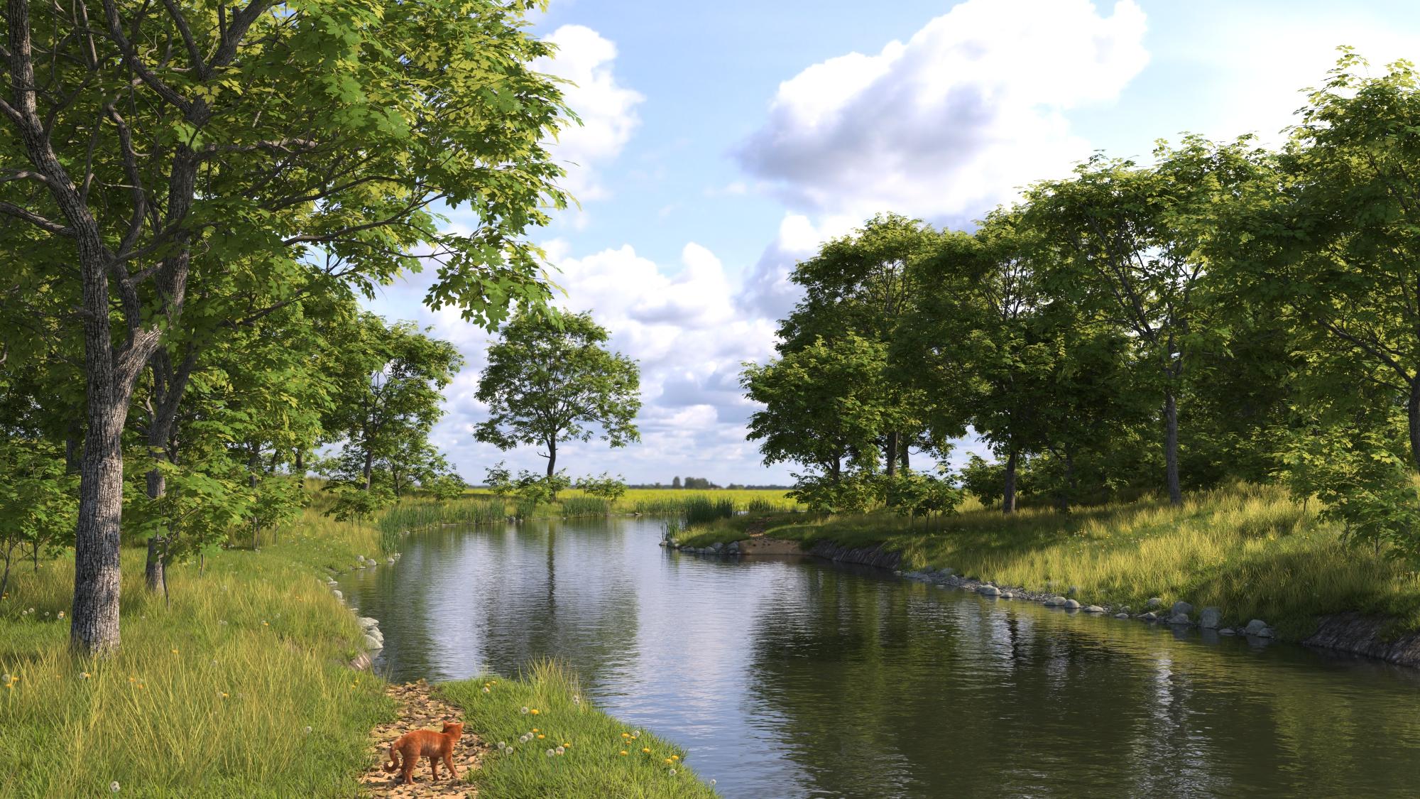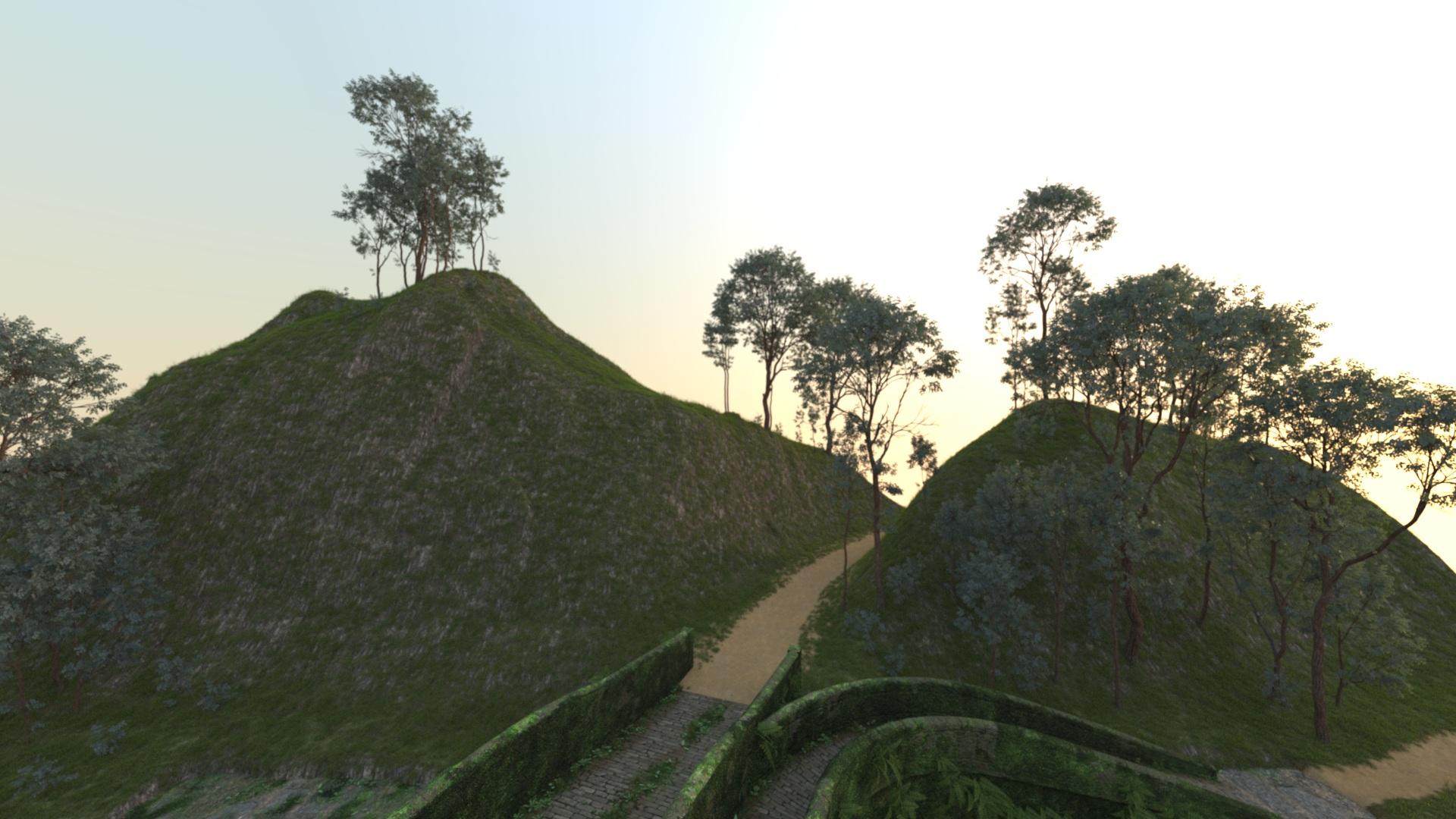 Here are renders of Snake Bridge 01 without the bridge feature props. In the first render, I just deleted the props. You can see an area where the bridge had been, where the growing grass is missing, because it was masked out to put the  bridge there. If that area doesn't catch your eye, even better!