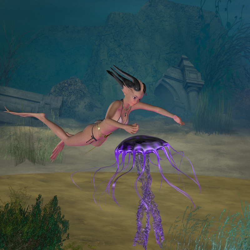 The next thing to talk about is your atmosphere. As KA1 has suggested, caustic or gel lighting is a way to get the sense of an underwater scene. You can also do it with cameras. In both cases the default lights and cameras in DAZ Studio have to be modified so I would recommend using the more advanced lighting and camera options. None of my free lights or camera products are available any more but here are three products that might help you in setting up your atmosphere: