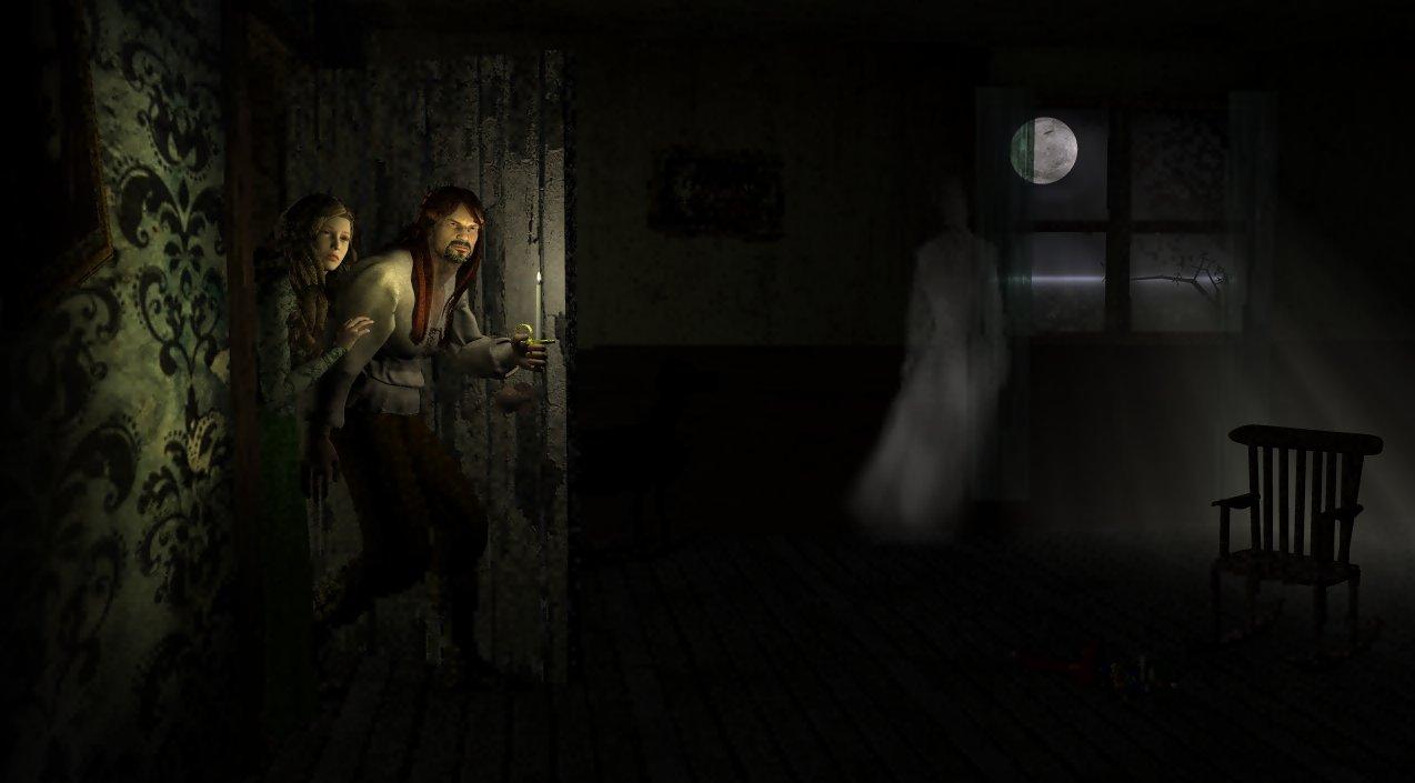 Nice compositon, I see a balance between the light of the candle and the ghost and the moon. I think the only thing and this is just a perference of mine is that I would put just a bit more detail, cobwebs, broken furniture, old and tattered fabric scattered around the room. Like I said that is my preference, if you like the bare space then I would not touch a thing.