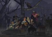 Terrific atmosphere and lighting. I love little details you threw in from the tap attached to the pumpkin to the zombie reaching for Louie's beer... he's dead... again!