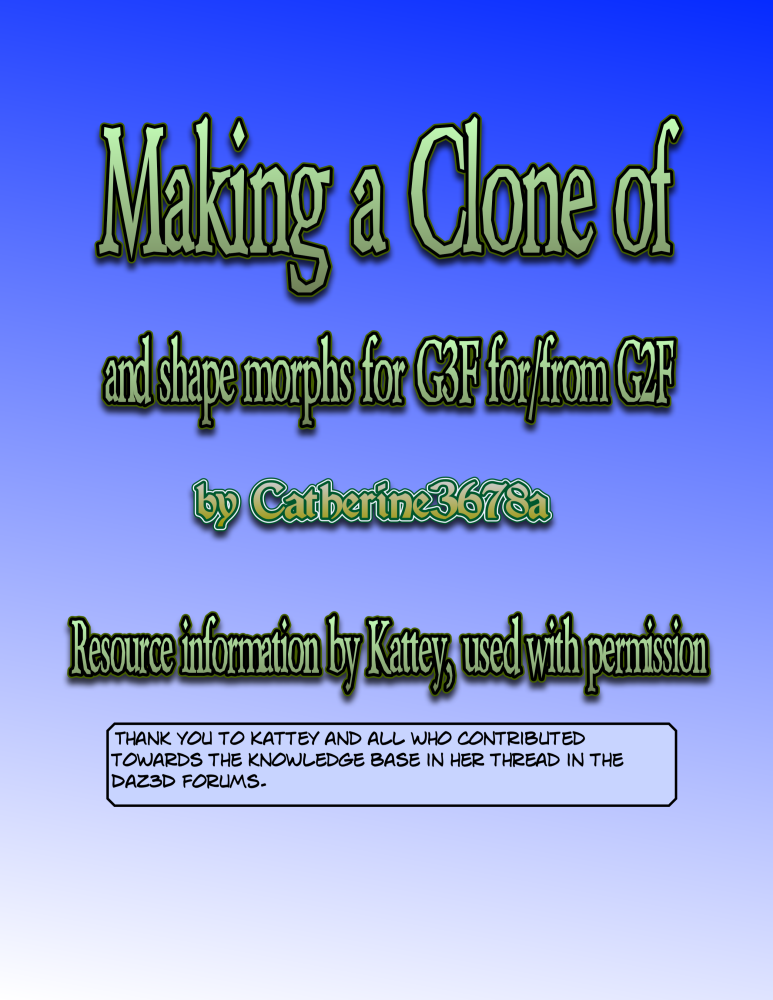 Tutorial WIP for "Making Clone Morphs for Genesis 3" from the G2 collection. Basically putting together some images to go along with the beautiful instructions from one of her posts in Kattey's thread [with her permission of course] plus taking it further to make some shape morphs over from G2 to G3. Keep in mind that these would in no way be better than buying the work of the Pros if/when they ever come out; nor would they all necessary work as well on G3 as they [hopefully] do on G2. But hay, the price is right ;-)