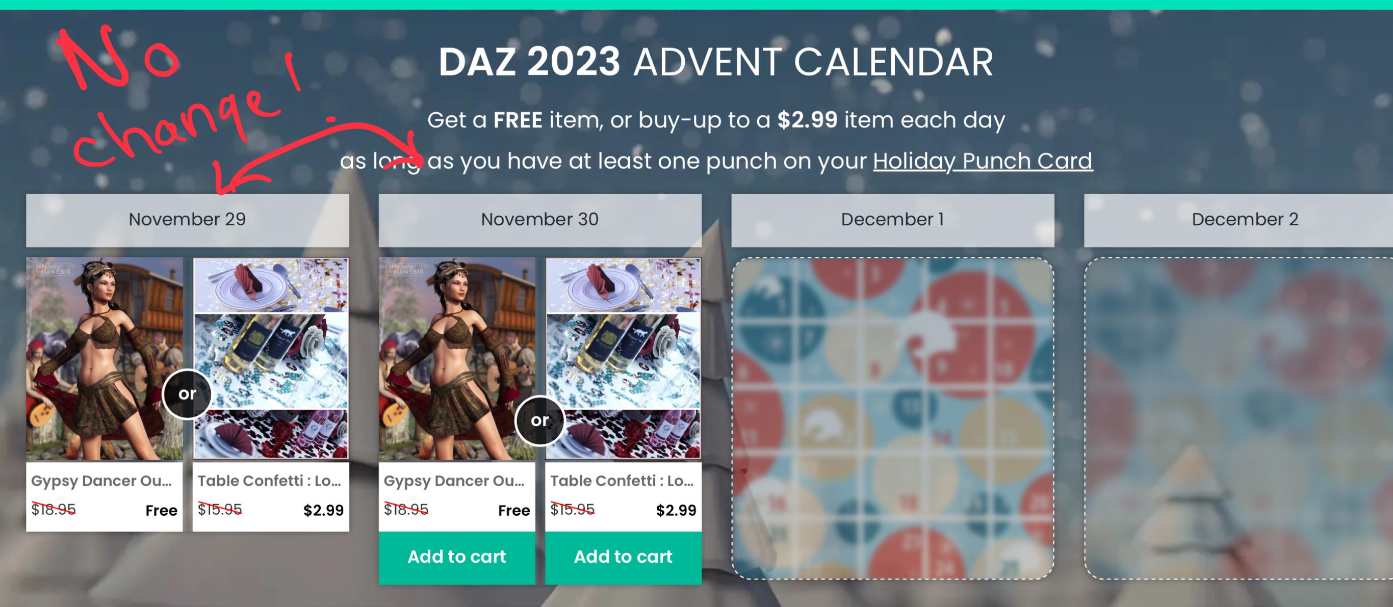 Happening here, too - Free advent item for today is not free in cart. Have not purchased the adjoining 2.99 item. I have three punches.