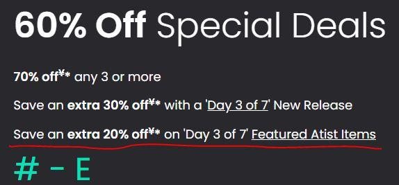 Hard to tell, as the text makes no sense. I'm trying to ask, what do they mean by having that "Save an extra 20% off¥* on 'Day 3 of 7' Featured Atist Items" in there.